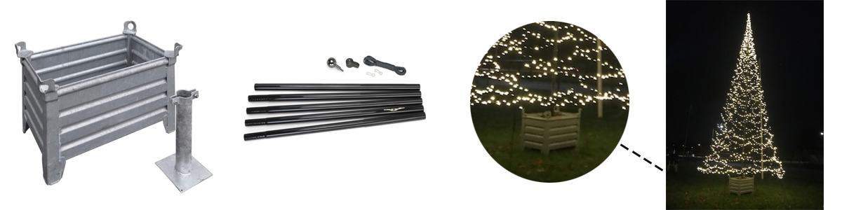 De masthouder is gevuld met beton en een kunststof standpijp en zorgt voor een stevig geheel van de LED kerstboom. Hierdoor hoeft de mast niet in de grond geplaatst te worden, maar staat hij stevig in de verplaatsbare, verzinkte vlaggenmastbak.