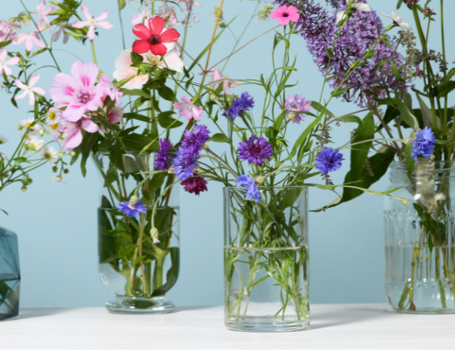 Glas is uitermate geschikt voor bloemenvazen, maar ook planten die weinig grond nodig hebben zoals een orchidee staan prachtig in een glazen pot of accubak. De kleur van het glas wordt vaak aangepast op de heersende kleurtrend. Naast vazen zijn er ook mooie windlichten en kandelaars van glas. Het luxe glas is helder, voor de wat robuustere uitvoering komen we vaak in het gerecycelde engiszins groen glaswerk terecht.
