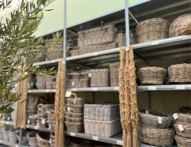 Vele maten en materialen zijn bij ons te zien. De meeste manden zijn gemaakt van wilgentenen en zijn vaak gevoerd met plastic. Naast de traditionele modellen zijn er ook wand- en hengselmanden. Een nieuw toegepast materiaal is salim en zeegras vaak versterkt door een metalen frame en als zodanig toe te passen als een woonmeubel zoals zitelementen, wasmanden en kubussen als bijzettafeltjes.