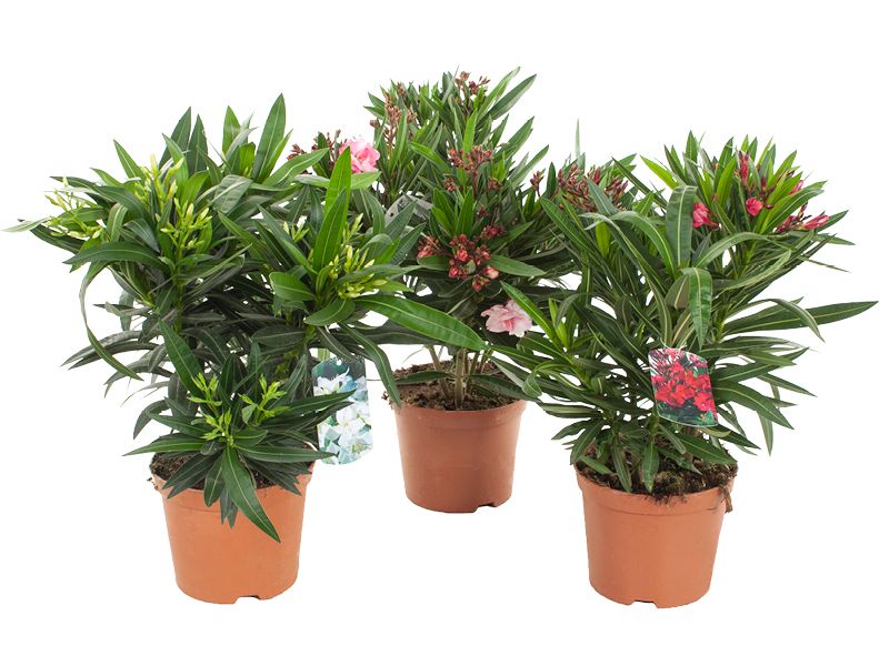 De subtropische oleander (Nerium oleander) groeit in het wild langs rivieren, beekjes en in bermen en kan wel 5 tot 6 meter hoog worden. Met zijn leerachtige, langgerekte bladeren en weelderige bloemtrossen is hij een opvallende  verschijning. De gekweekte versies hebben rode, roze, witte, oranje of gele bloemen. Deze soorten halen in ons klimaat een maximale hoogte van 2.5 meter. Zet deze struik op een zonnige plek. Je zult in warme zomers merken dat zonnebaden voor meer bloemen zorgt. Dan lijkt het net of je aan de Méditerranée bent neergestreken.